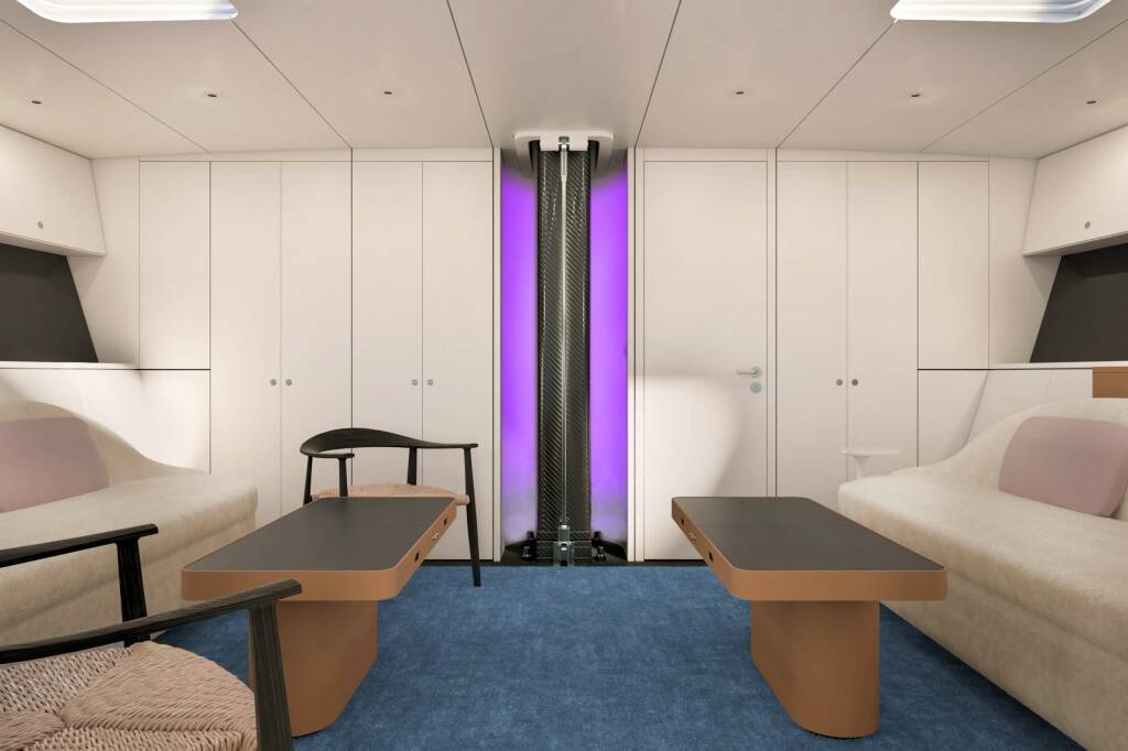 THE INTERNAL LIVING AREA IS LOCATED BETWEEN THE GUESTS' CABINS AND THE MASTER AREA.
