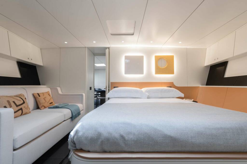 Accommodation: Suitable for 6 guests in 3 cabins including one double queen size master cabin forward, with sofa and office area. Also has a large ensuite bathroom with tub and shower. Twin cabins have separate single beds and separate showers