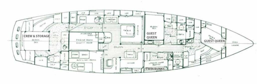 Accommodation: (2) Queen master cabins have a private ensuite head and stall shower. (1) Bunk Bed Room