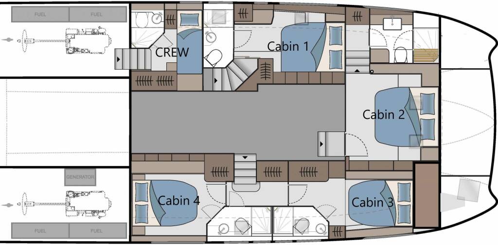 The beautiful 54-foot Aquila Power Catamaran offers 4 spacious cabins each with private head and AC control for your guests to enjoy. 5th Cabin for crew.