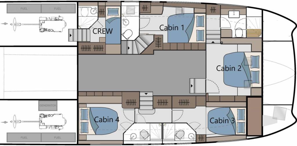 Presentiamo The Wandering Hillbilly: Catamarano di lusso varato nel 2026. L'allestimento interno con 4 cabine, puo' ospitare comodamente 8 ospiti.