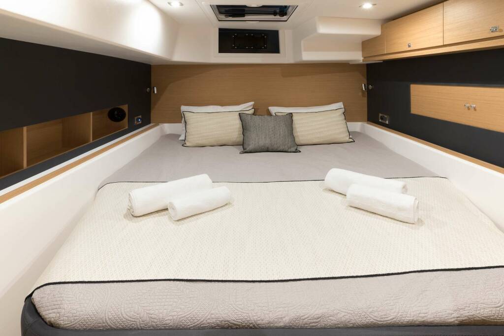 She can accommodate 10 people on board. There are four queen beds with ensuites and one Pullman cabin suitable for children or teenagers, which is also ensuite. All the equipment onboard is new; there is a 10-HP tender for water sports; and multiple sunbathing decks, including the spacious flybridge.