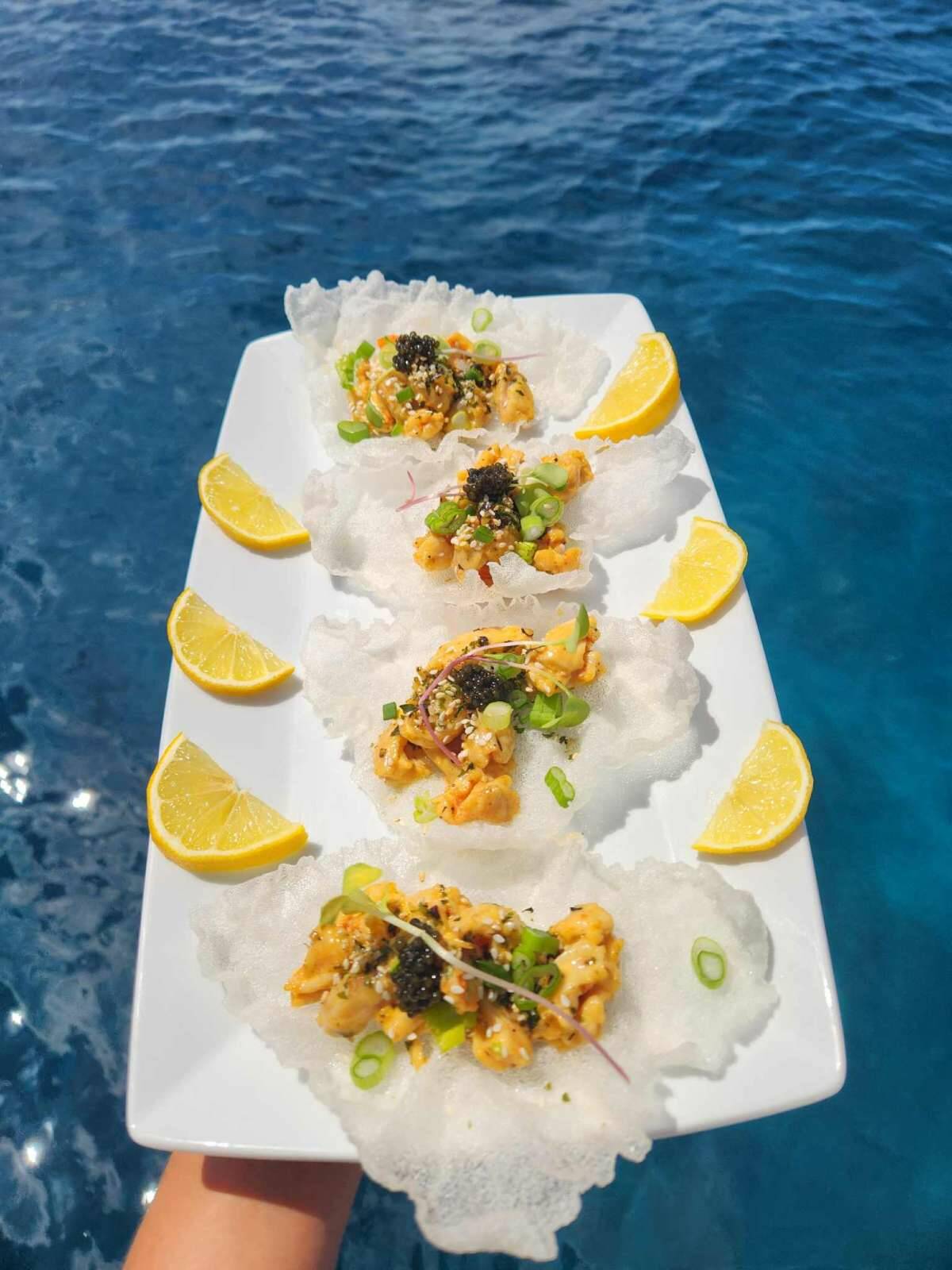 Half Board Option: Includes 7 breakfasts, 4 lunches & 3 dinners. Requires 3 lunches & 4 dinners ashore at client expense. Deduct $150/per person from the all-inclusive charter rate for half board. The entire yacht must choose either half board or full board.