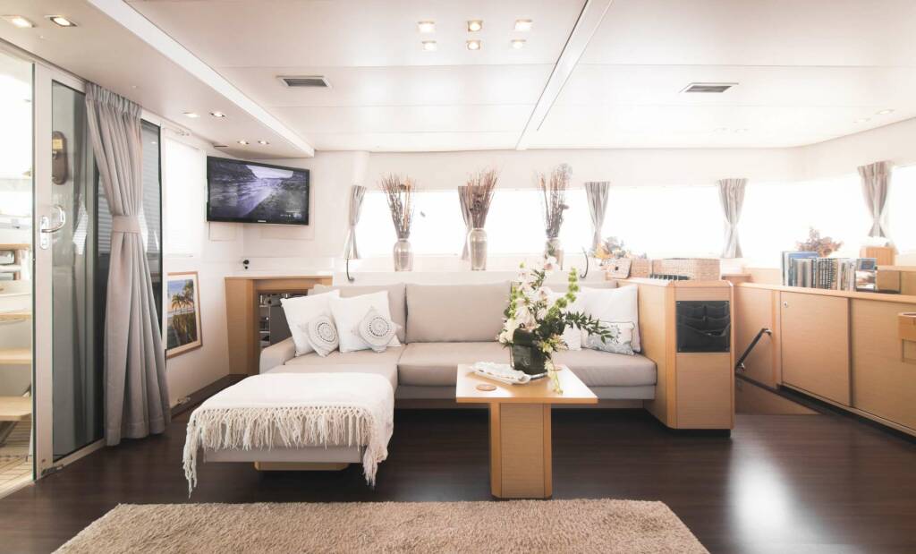 This allows for a spacious and modern interior lounge area with a large flat screen television and inside dining for 8 guests.