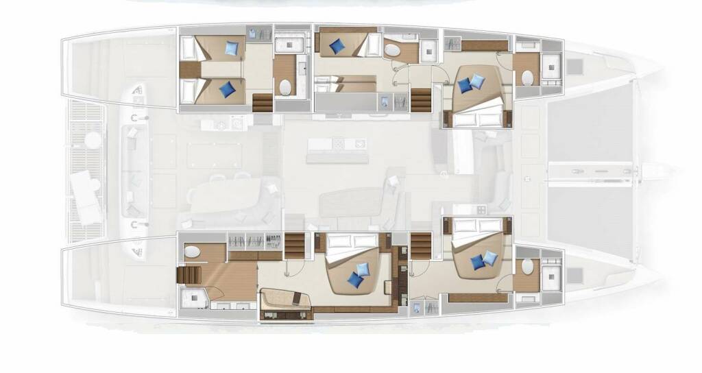 I master + 2 doubles for adults, and the midship port double twin cabin for teens/kids. Crew takes aft port cabin.