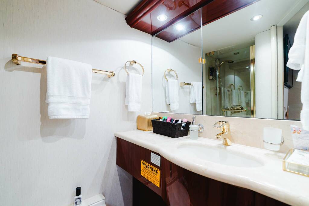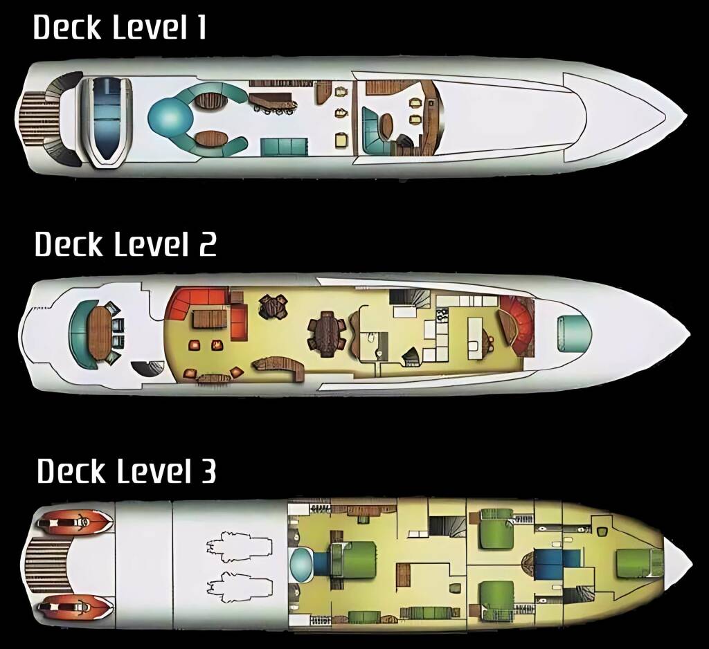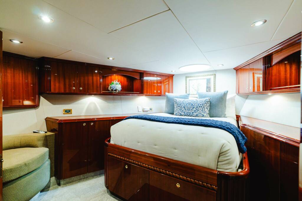 Accommodation: Comfortably sleeping 8 in an exceptional 4 x stateroom layout that features an exquisite master suite and three VIP suites. The master has an ADJOINING study which may be used as an additional cabin. Crew quarters are located in aft and accommodate 4.