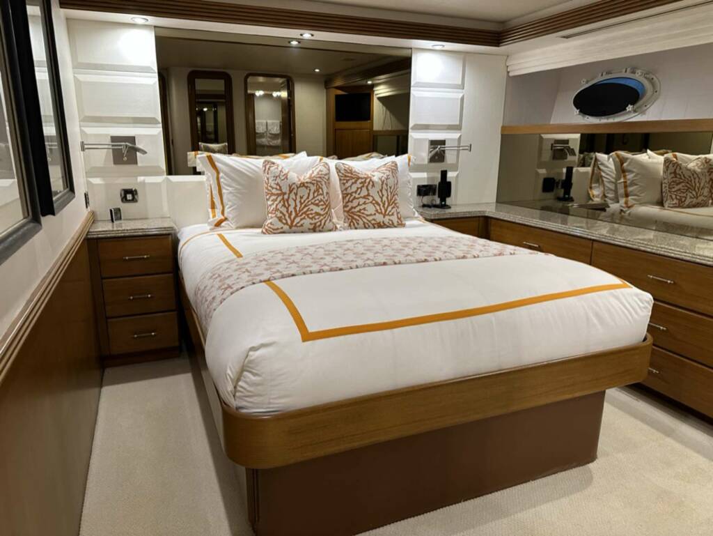 Accommodation: ISLAND GIRLS's interior configuration has been designed to comfortably accommodate up to 8 guests overnight in 4 cabins, comprising a master suite, 1 VIP stateroom, 1 double cabin and 1 twin cabin. She is also capable of carrying up to 5 crew onboard in 3 cabins to ensure a relaxed luxury yacht experience.