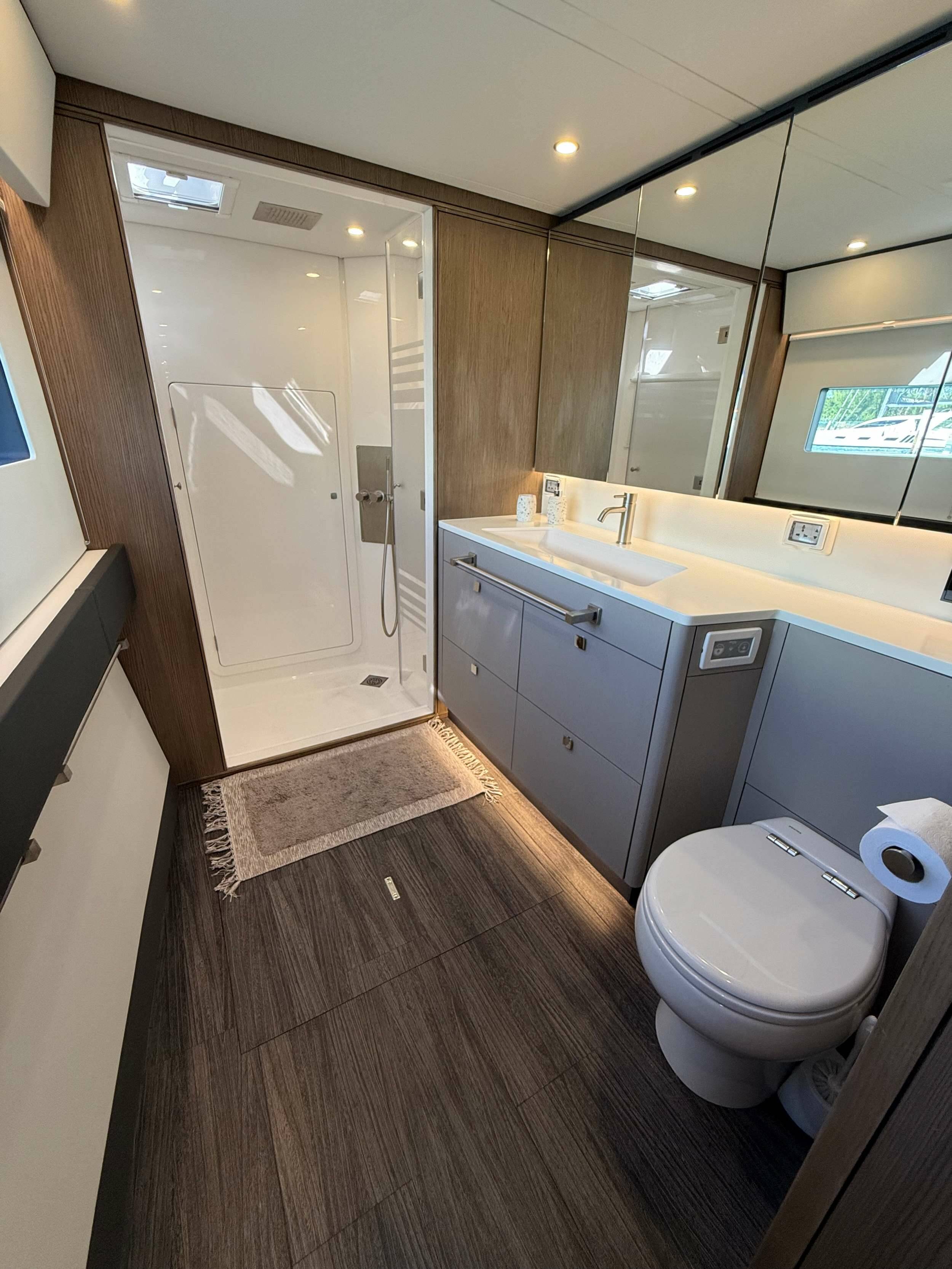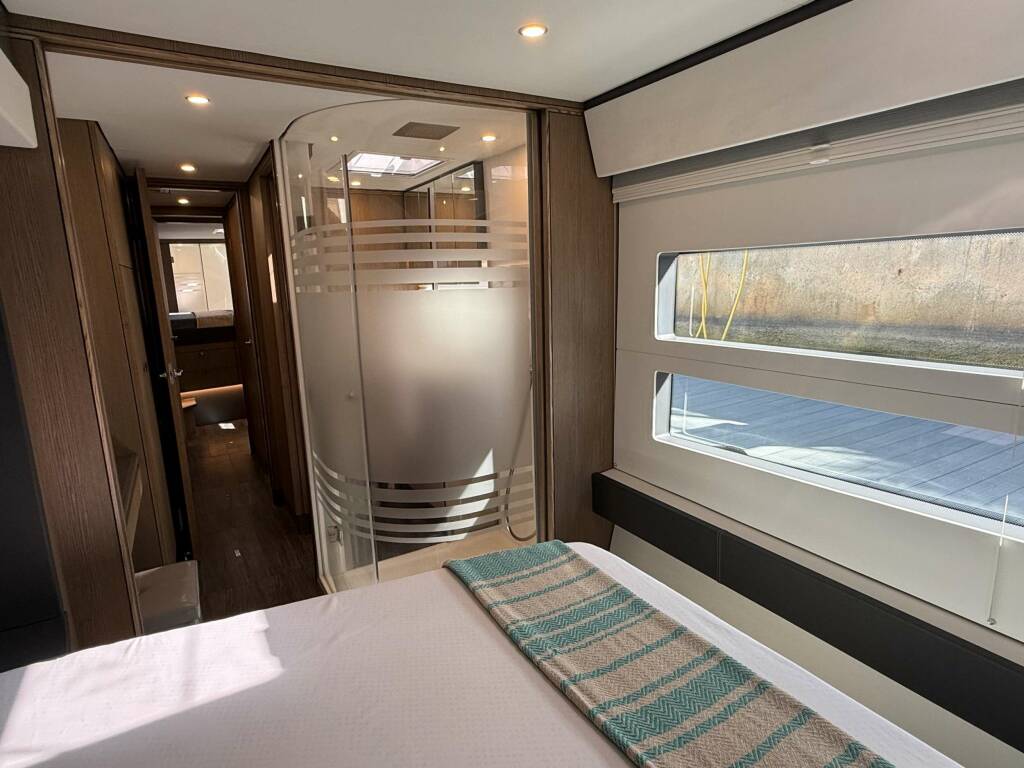 Motore Luxury accommodations with owner's version master suite with walk in wardrobe and huge bathroom taking up the entire port hull of this 61' cat.