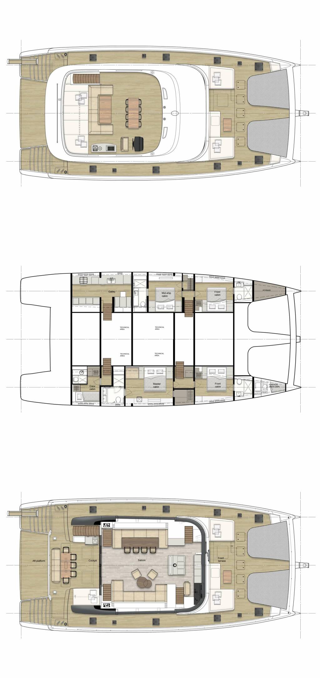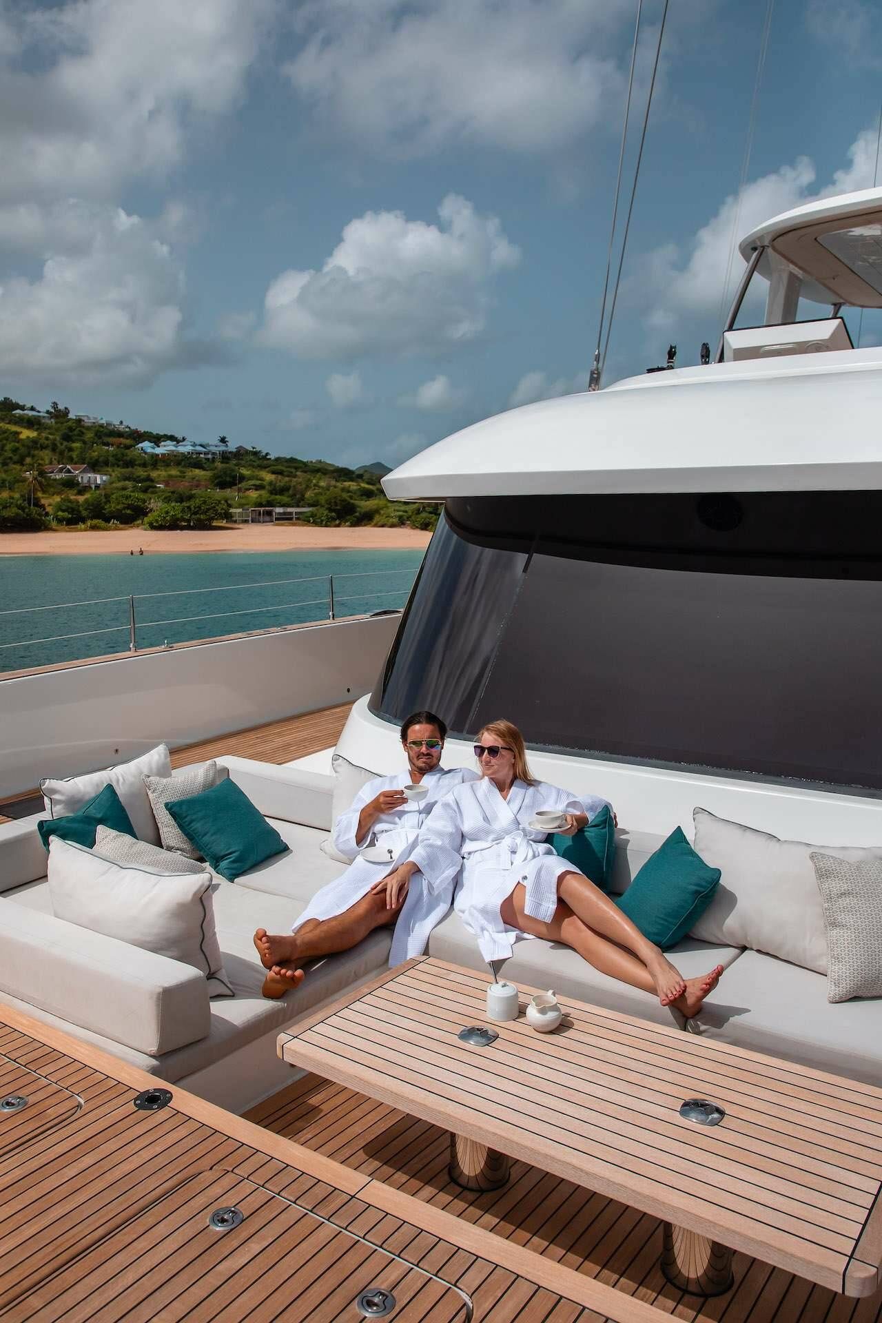 Large saloon (galley down model), oversized top desk for 360 degree view and large aft deck for alfresco dining.