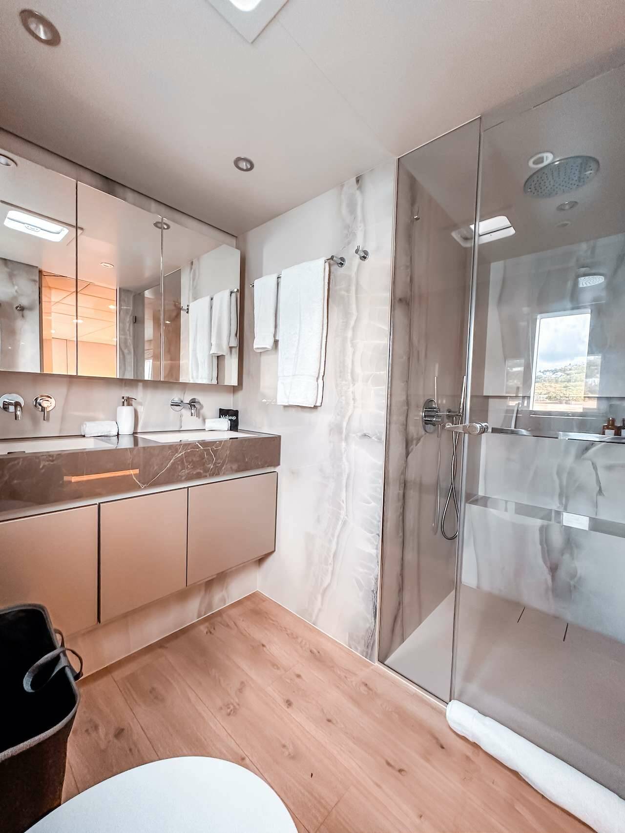 Accommodation: One king master cabin plus 3 queen cabins (NOTE: two of the queen cabins can be split and made into 2 twin beds). Dimensions listed below. All have ensuite private baths with stall showers, fresh water flush electric heads and vanity with sinks.