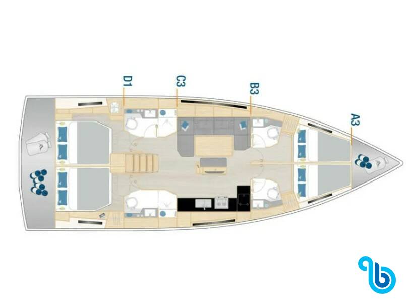 Skipper nie jest wliczony w cenę łodzi. Możliwe będzie dodanie skippera podczas procedury potwierdzania: koszt wynosi zwykle od 180 do 250 euro za dzień; skipper wymaga dedykowanej kabiny. Po sprawdzeniu u operatora BeBlue będzie można poprosić o to, aby skipper spał w jadalni (centralny salon).