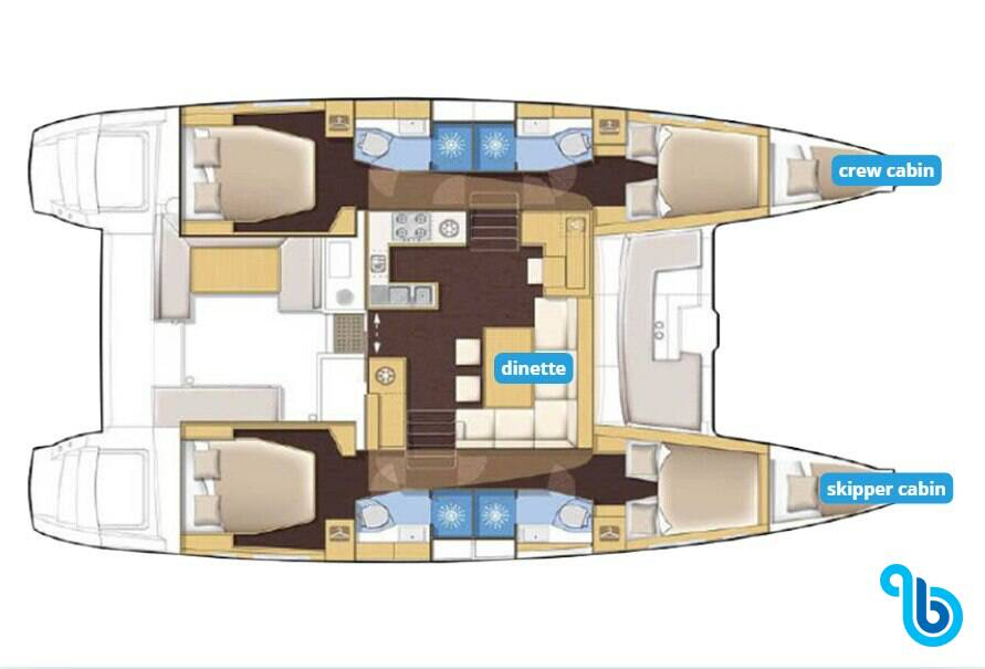 Skipper nie jest wliczony w cenę łodzi. Możliwe będzie dodanie skippera podczas procedury potwierdzania: koszt wynosi zwykle od 180 do 250 euro za dzień; skipper wymaga dedykowanej kabiny. Po sprawdzeniu u operatora BeBlue będzie można poprosić o to, aby skipper spał w jadalni (centralny salon).