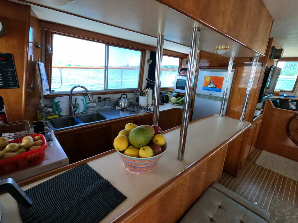 Accommodation: This powerful Transcat 48 (Privilege Power Cat) is an ideal long-range family cruiser, which relies on strong principles of space, comfort, range and simplicity, with a hull designed for comfort at sea and at anchor. Her main saloon, Galley, and cockpit, which are all enormously spacious, are all one level! Her fly-bridge is just as comfortable and roomy!