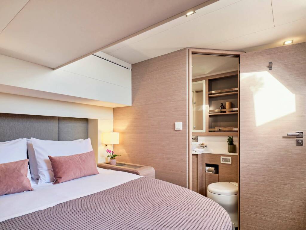 Accommodation: PIXIE can accommodate 9 guests in total. She has 1 master cabin with queen size bed (size between queen and king bed) a desk area, a full bathroom with a double sink, and two entrance points (one entrance from the inside of the boat and the other from the foredeck jacuzzi area). Two queen-sized guest cabins with private bathroom. One triple cabin with one double bed and one single bunk bed with private bathroom.