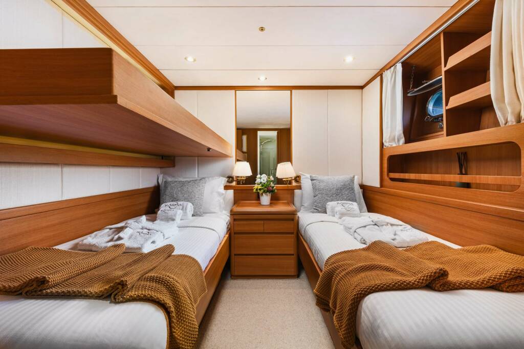 2 Twin Cabins with 2 single beds each. One of the Twin cabins has a pullman bed. Each Twin cabin has ensuite bathroom.