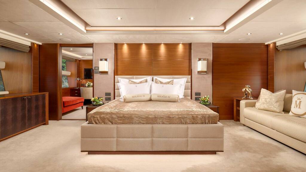 Accommodation: MIRAGE IV is a 40-meter Princess yacht that comfortably accommodates up to 12 guests across six luxurious staterooms. The expansive master suite, situated at the bow on the main deck, spans the full beam of the yacht. This opulent suite features a private office, ample storage space, separate wardrobes for him and her, and an en-suite bathroom equipped with a walk-in shower, ensuring a serene and indulgent stay on board.