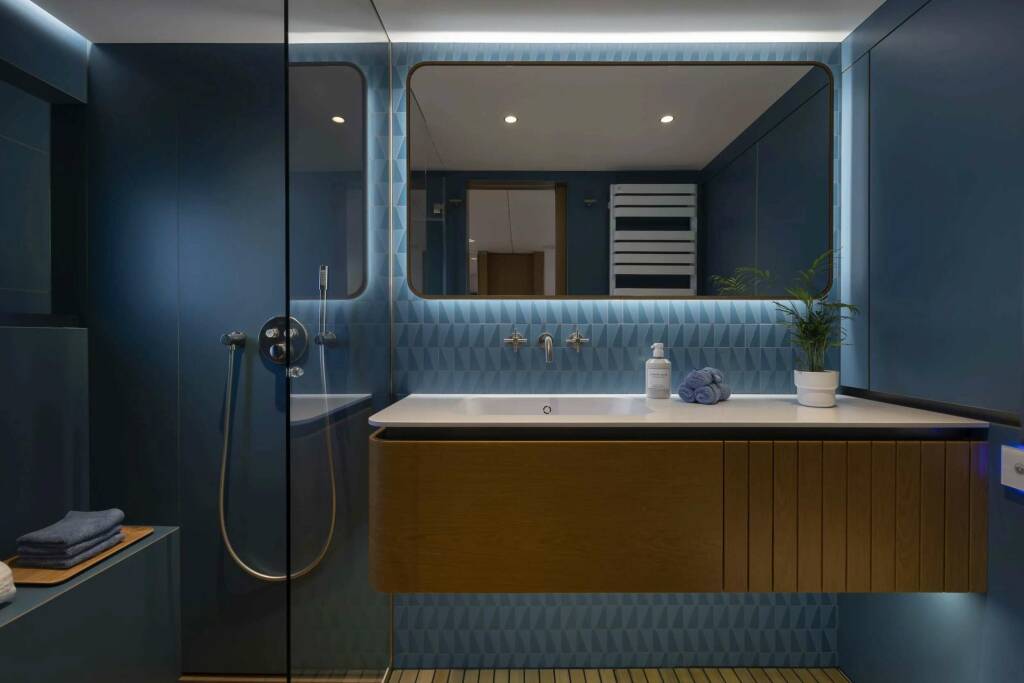 Accommodation: The four guest cabins are thoughtfully arranged, with a spacious master suite with king berth in the port hull, a double midships cabin, a twin forward cabin, and an aft cabin featuring a double bed plus a Pullman in the starboard hull. Each cabin offers the comfort and privacy of ensuite facilities, with the master distinguished by striking azure blue tiling and an expansive shower cubicle. The remaining suites continue the theme, accented with touches of azure blue and clean, contemporary lines.