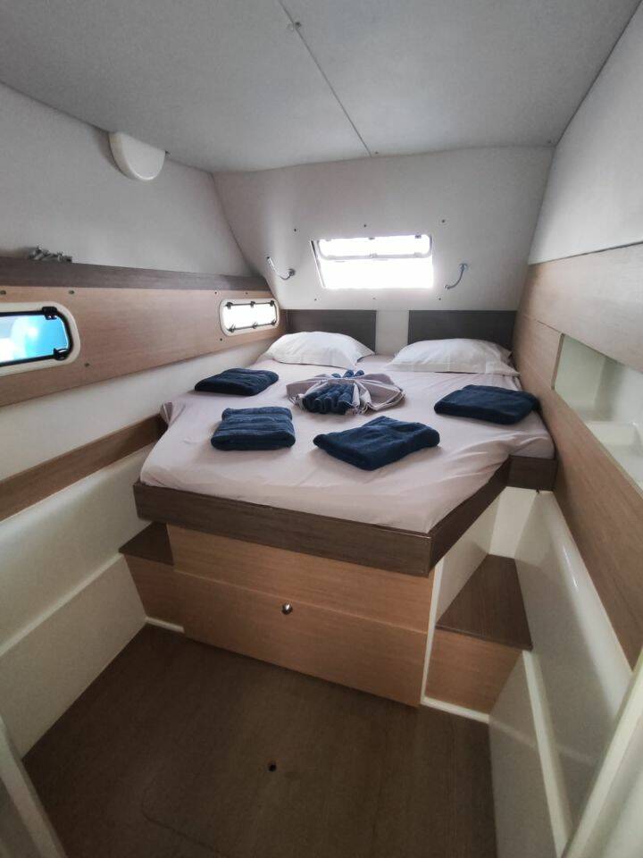 "Un buon catamarano a un ottimo prezzo con alcune lacune: cuscini in materiale plastico usurati e spesso mancanti che saltano all'occhio degli ospiti, A/C assente (rispetto a molti altri della flotta). Frigo grande e potente. Batterie che richiedevano ricarica tramite motore di almeno 4h giorno (no generatore). Dissalatore scarso ma funzionante. Indicatore del vento solo in dinette."
