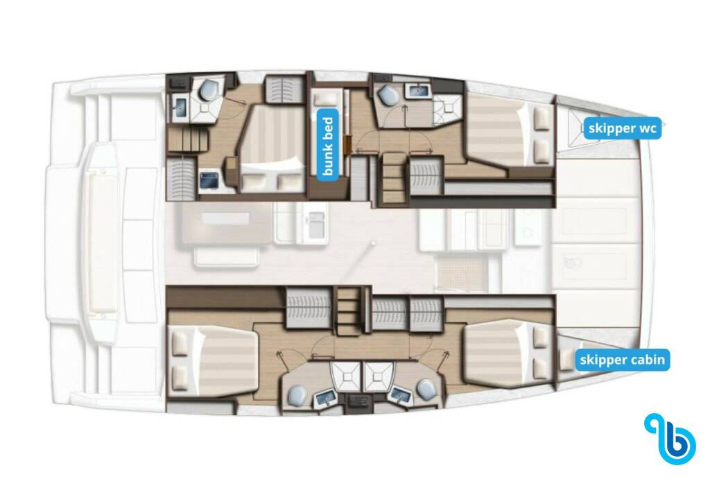 Kapitán nie je zahrnutý v cene lode. Kapitána je možné pridať počas potvrdzovacieho postupu: cena sa zvyčajne pohybuje od 180 do 250 EUR na deň; kapitán potrebuje vyhradenú kajutu. Po overení u prevádzkovateľa BeBlue bude možné požiadať, aby kapitán spal v jedálenskom kúte (centrálny salónik).