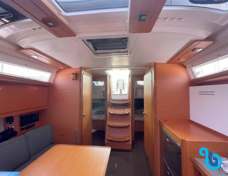 Dufour 390 Grand Large PRESTIGE (Plachetnica), bola spustená na vodu v roku 2023 a kotví v Iónské ostrovy (Grécko) v meste Lefkas, D-Marin. Trup je vybavený 3 kajutami a 3 wc a je schválený na pohodlné ubytovanie 6 + 2 osôb.