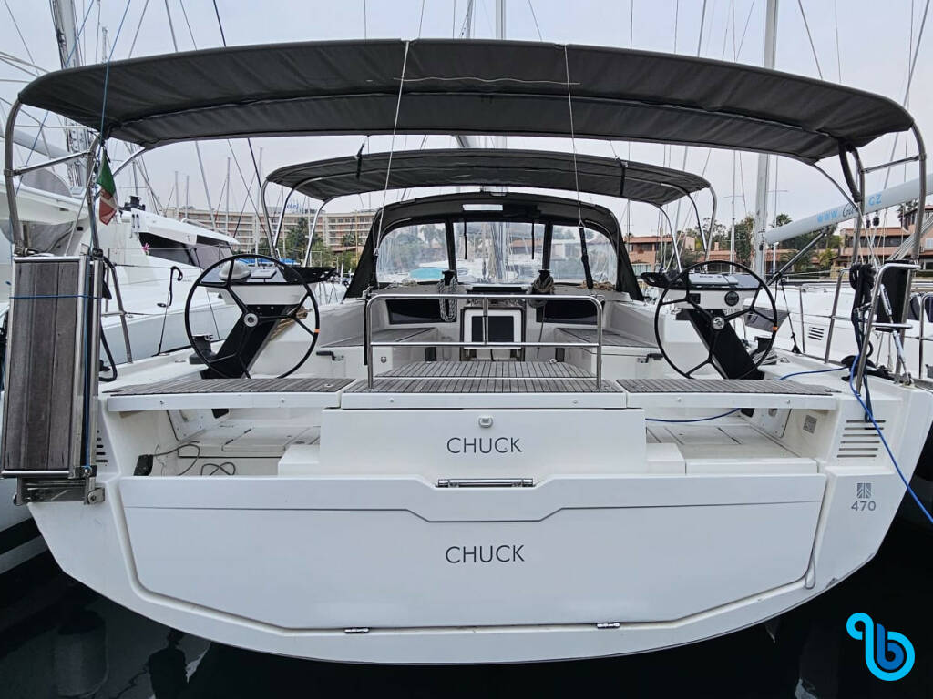Dufour 470 Grand Large Chuck (Plachetnica), bola spustená na vodu v roku 2024 a kotví v Taliansko - Sicília, Eolie v meste Sicily, Portorosa. Trup je vybavený 5 kajutami a 3 wc a je schválený na pohodlné ubytovanie 8 osôb.