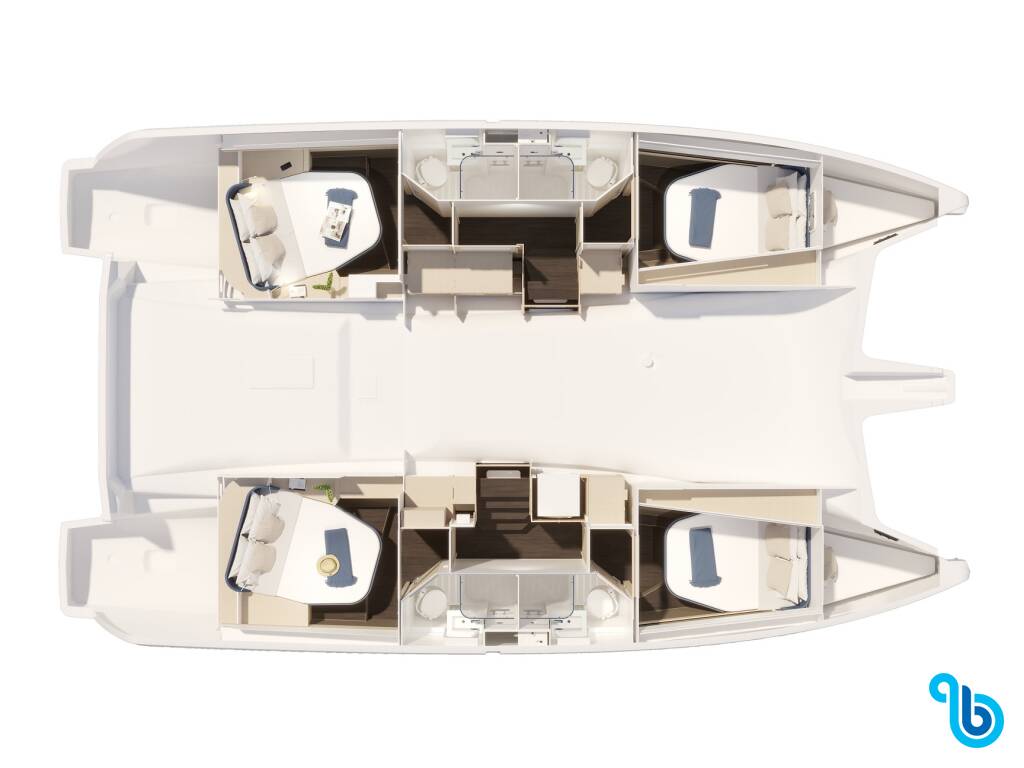 Fountaine Pajot New 44 Quatuor Skywalker (Katamarán), bol spustený v r2026 a sídli v Splitský región (Chorvátsko) mesta Trogir, Yachtclub Seget (Marina Baotić). Trup je vybavený o 4 + 2 kabíny a 4 toaleta a je schválený na pohodlné ubytovanie 8 + 2 ľudí.