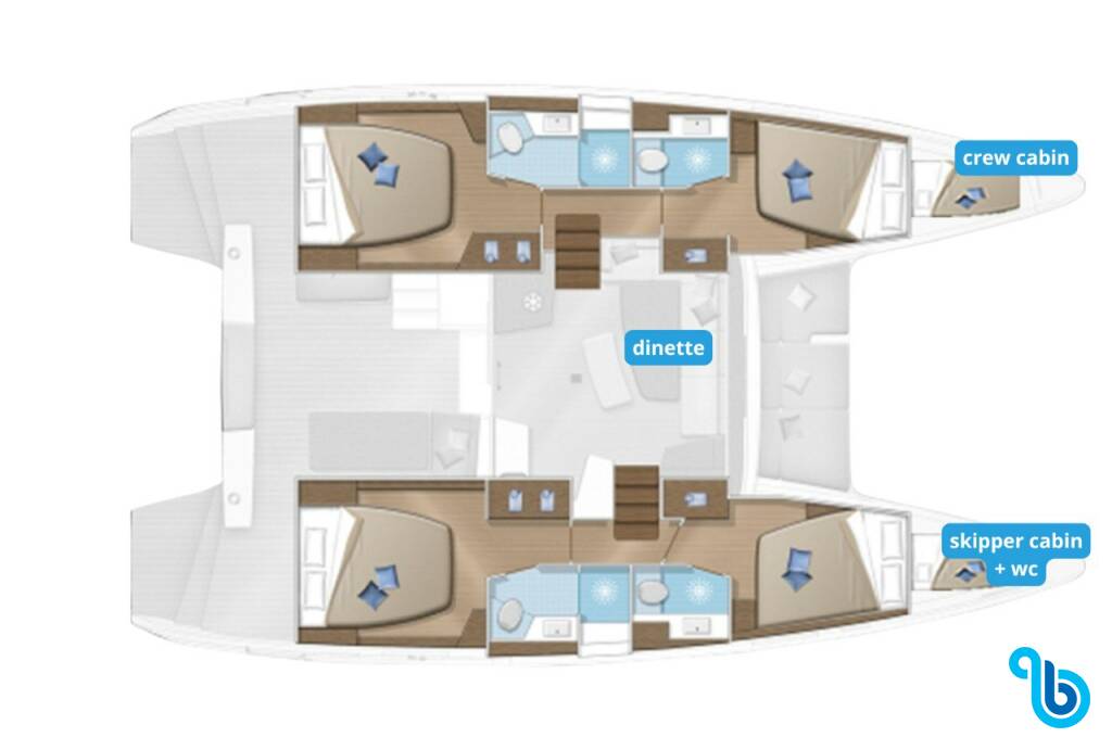 Kapitán nie je zahrnutý v cene lode. Kapitána je možné pridať počas potvrdzovacieho postupu: cena sa zvyčajne pohybuje od 180 do 250 EUR na deň; kapitán potrebuje vyhradenú kajutu. Po overení u prevádzkovateľa BeBlue bude možné požiadať, aby kapitán spal v jedálenskom kúte (centrálny salónik).