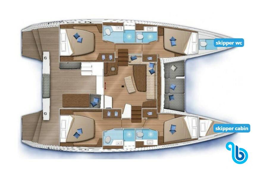 Kapitán nie je zahrnutý v cene lode. Kapitána je možné pridať počas potvrdzovacieho postupu: cena sa zvyčajne pohybuje od 180 do 250 EUR na deň; kapitán potrebuje vyhradenú kajutu. Po overení u prevádzkovateľa BeBlue bude možné požiadať, aby kapitán spal v jedálenskom kúte (centrálny salónik).