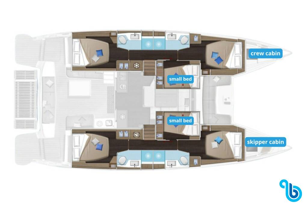 Kapitán nie je zahrnutý v cene lode. Kapitána je možné pridať počas potvrdzovacieho postupu: cena sa zvyčajne pohybuje od 180 do 250 EUR na deň; kapitán potrebuje vyhradenú kajutu. Po overení u prevádzkovateľa BeBlue bude možné požiadať, aby kapitán spal v jedálenskom kúte (centrálny salónik).