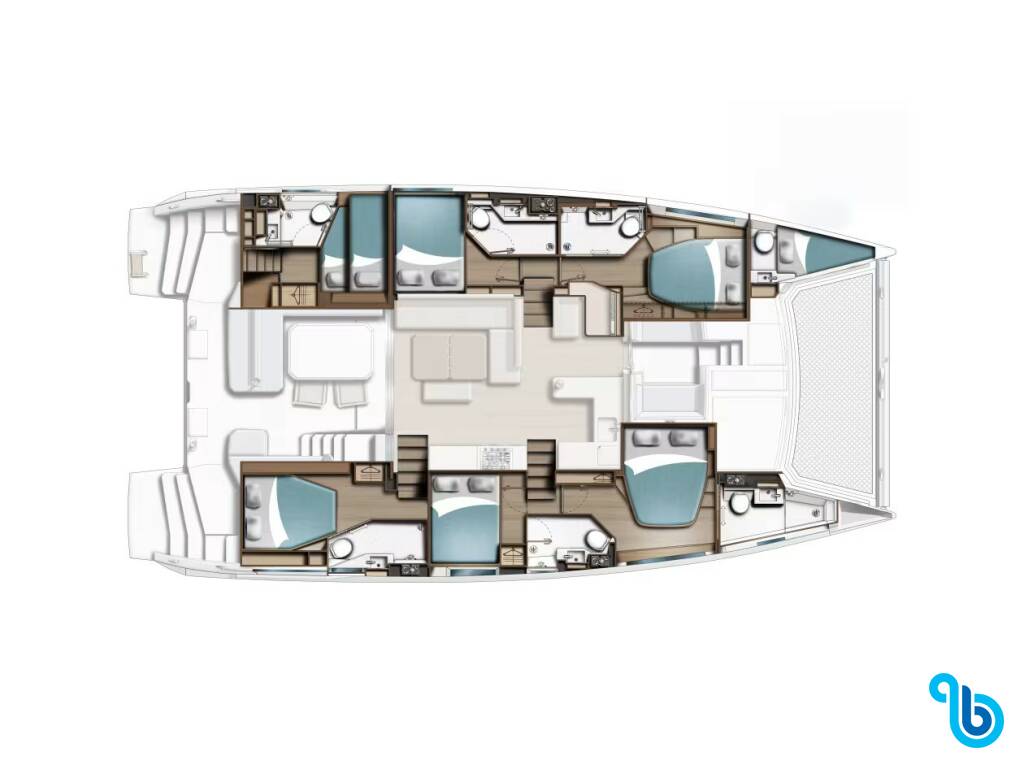 Moorings 5200 (Katamarán), bola spustená na vodu v roku 2026 a kotví v Turecko Fethiye / Gocek v meste Yacht Club Mai-Fethiye. Trup je vybavený 6 kajutami a 6 wc a je schválený na pohodlné ubytovanie 12 osôb.