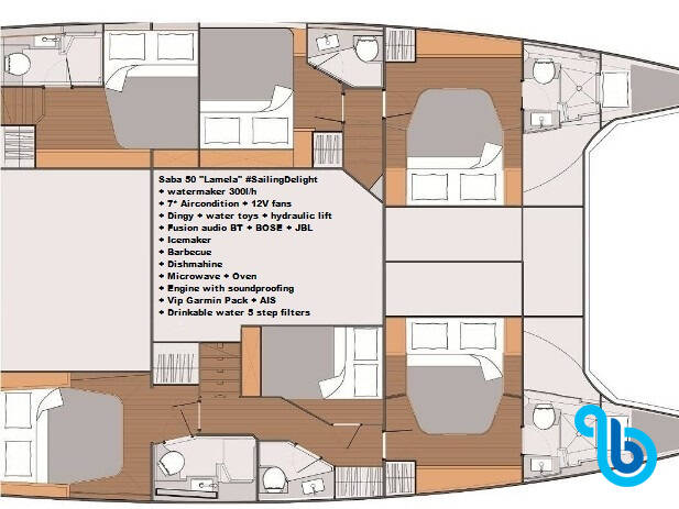 Saba 50 Lamela (Katamarán), bol spustený v r2018 a sídli v Iónské ostrovy (Grécko) mesta Lefkas, Marina Lefkas. Trup je vybavený o 6 kabíny a 6 toaleta a je schválený na pohodlné ubytovanie 14 ľudí.