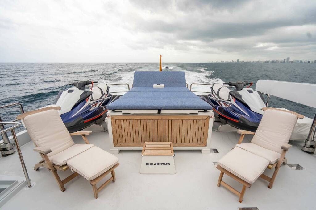 Luxusný katamarán RISK & REWARD, postavená v roku 2004, kotví v Bahamas. Má 4 kajút, môže ubytovať 9 osôb.