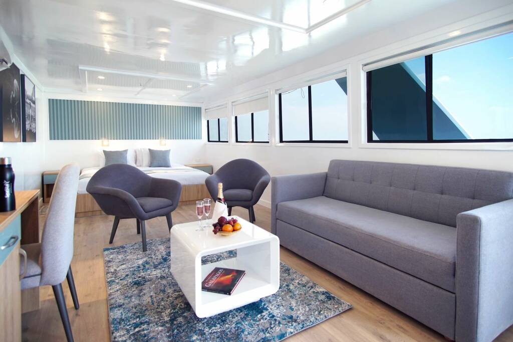 Upper Deck: Dining room, lounge, 3 Galapagos Suites (271 ft2 / 25 m2), 1 Sea Star Suite (378 ft2 / 35 m2)