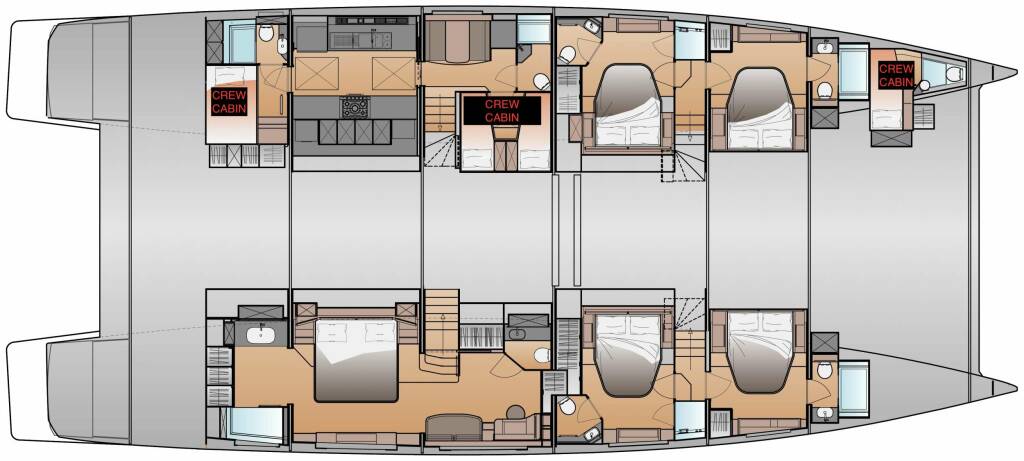 Accommodation: One master cabin (Bed size 1,80 x 2,00 m) and four queen bed guest cabins (bed sizes 1,60 m x 2,00 m) all with private facilities