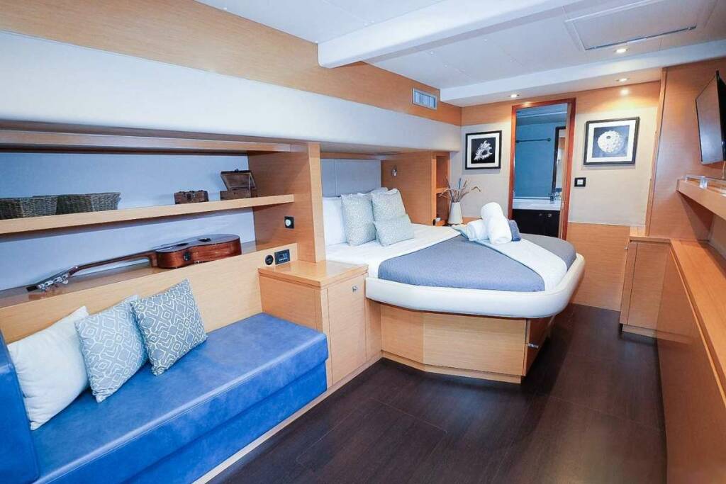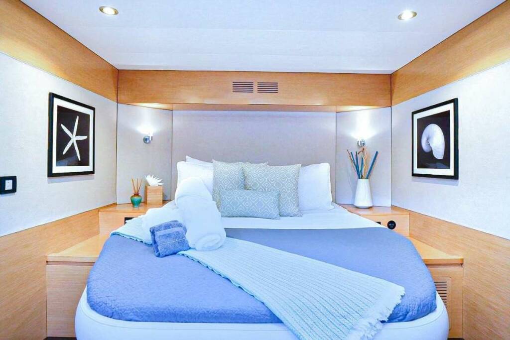 Accommodation: 3 large queen cabins and an enlarged Primary cabin, all with walk around queen size beds, all fully en suite. FULL A/C throughout the yacht.