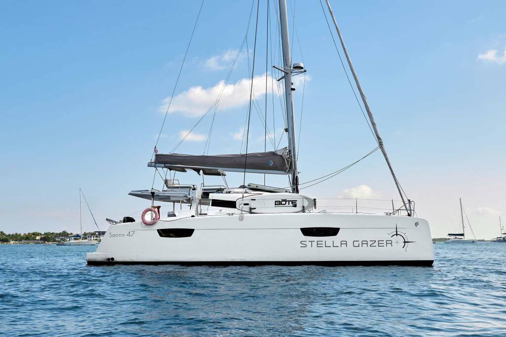 Luxusný katamarán Stella Gazer, postavená v roku 2018, kotví v Bahamas. Má 4 kajút, môže ubytovať 8 osôb.