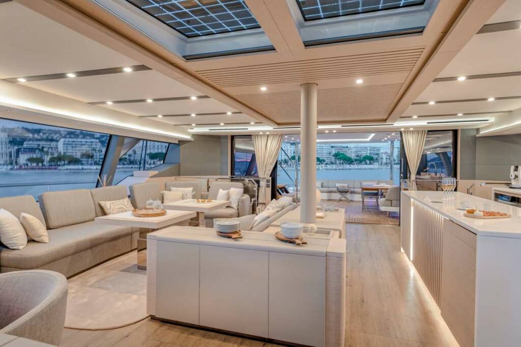 The foredeck is the ultimate sun worshippers haven with vast, luxurious loungers in place of the nets typically seen on catamaran foredecks, also features sunken sofas and a deck jacuzzi!