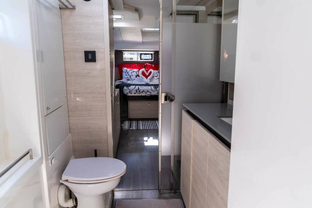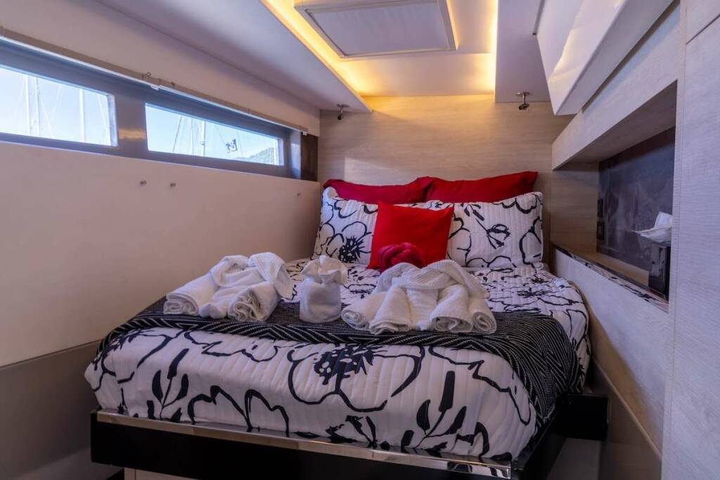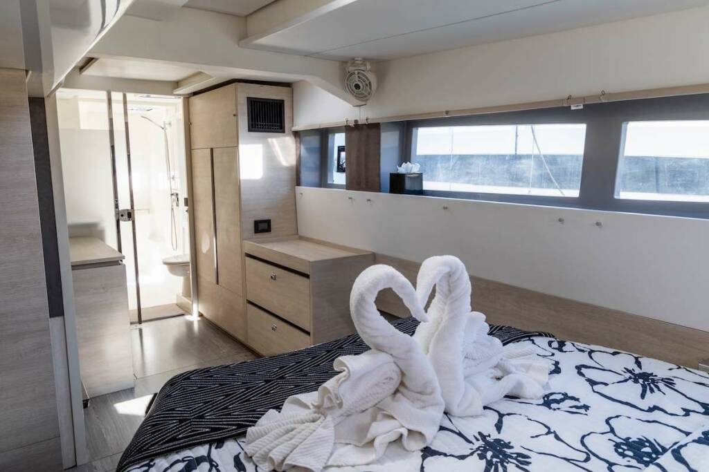 Salon has lounge area, galley, nav station, formal dining area and door opening to front cockpit as well as aft deck. Salon can be opened with beautiful natural breeze and is also fully air conditioned for guests comfort.
