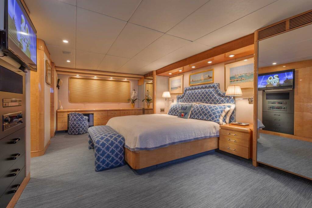 The master stateroom is full width below with a King Size bed and Jacuzzi Tub.
