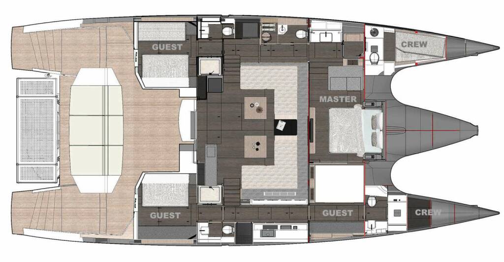 Accommodation: Master centre-line king suite forward and two aft queen berth suites.