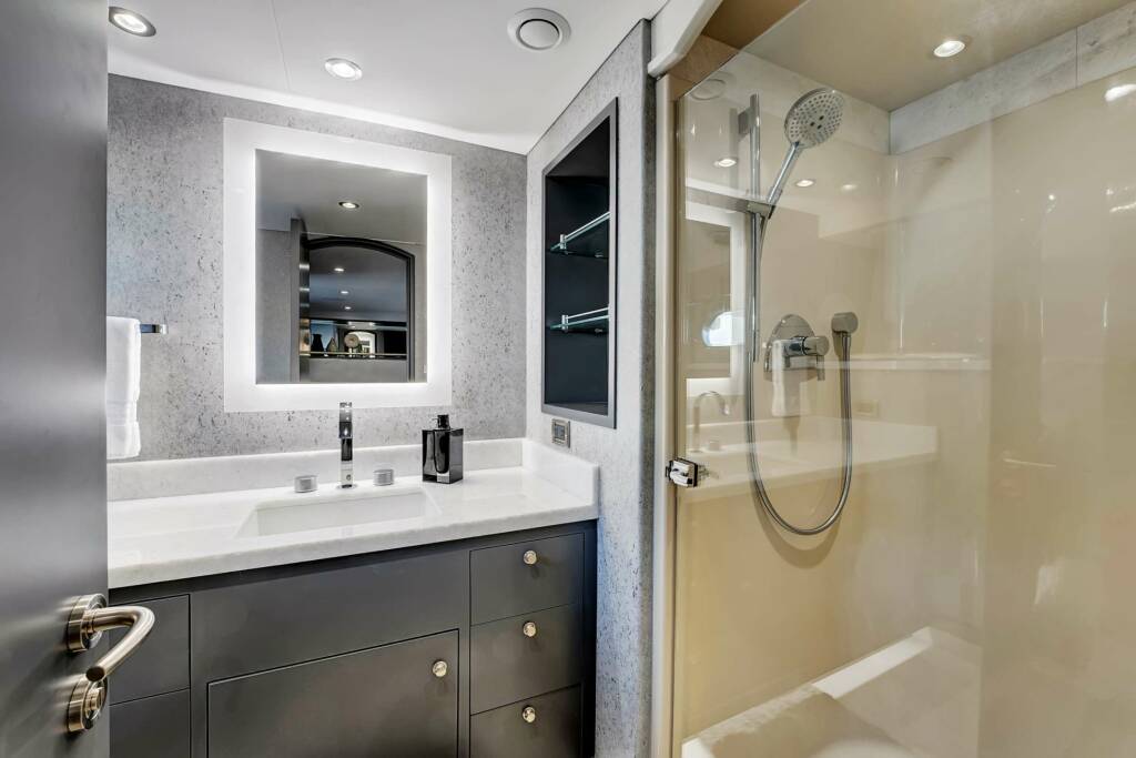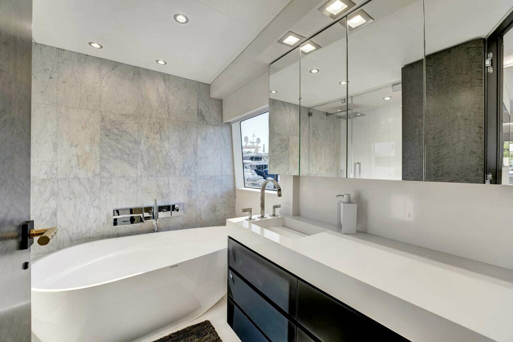 Master Stateroom: King Bed, full beam, on-deck. Ensuite bathroom has a large soaking bathtub in addition to a grand shower with a rain head.