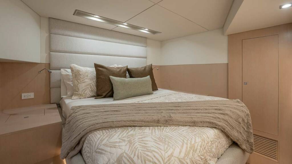 Accommodation: EARNOUT has been meticulously crafted to provide an unparalleled experience for up to six charter guests, ensuring that every moment aboard is infused with comfort and elegance. Featuring three exquisite suites, guests will indulge in the luxury of two sumptuous queen-size beds, and one king size bed which converts to twin beds, and they all have private en-suite bathrooms. Each cabin has an independent A/C, with high quality bed linens and towel sets, making it the perfect haven for relaxation. Each suite is designed to reflect the unique preferences of our guests, creating a serene and inviting ambiance that enhances the overall charter experience.