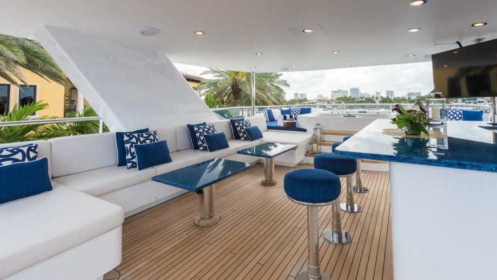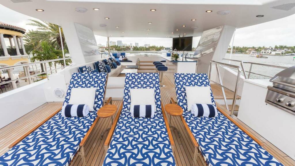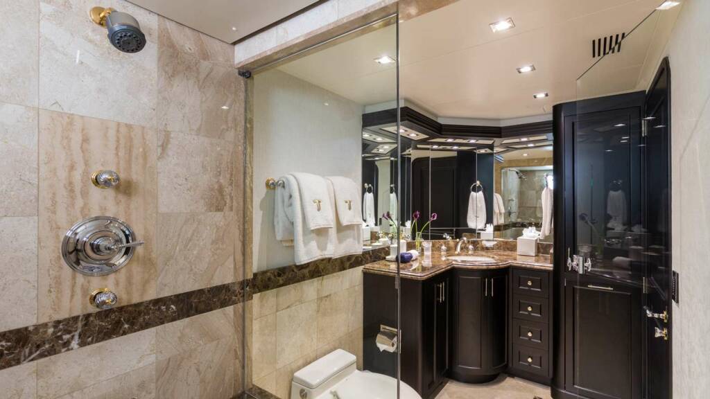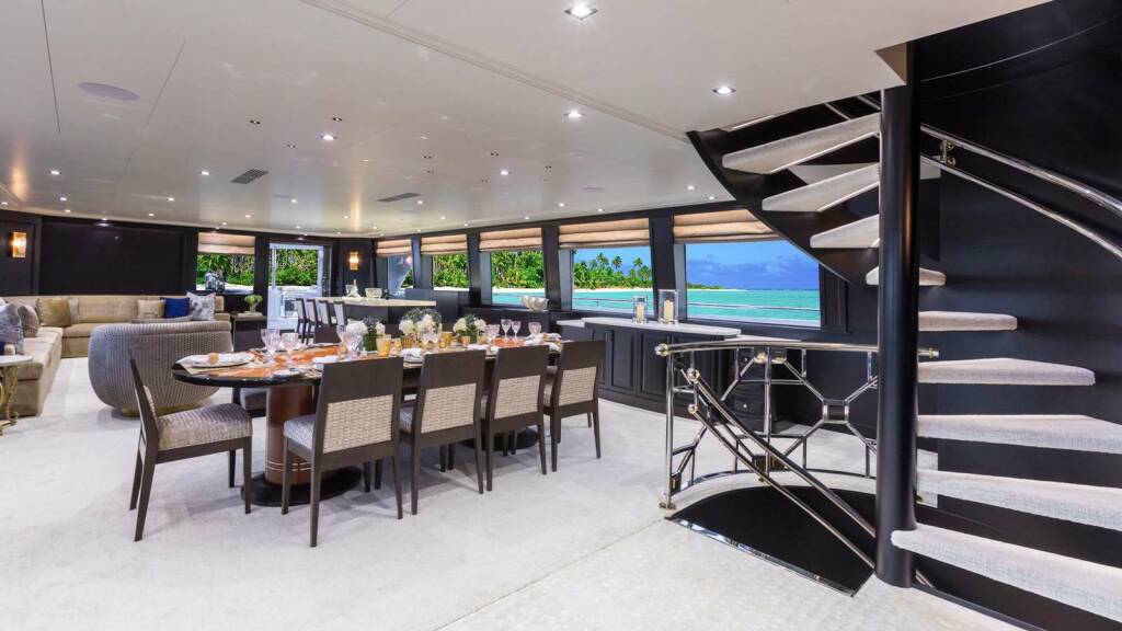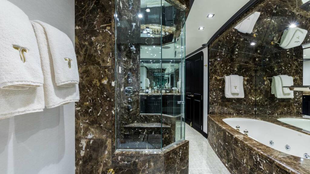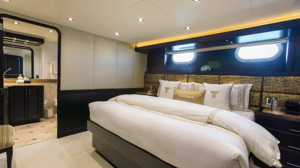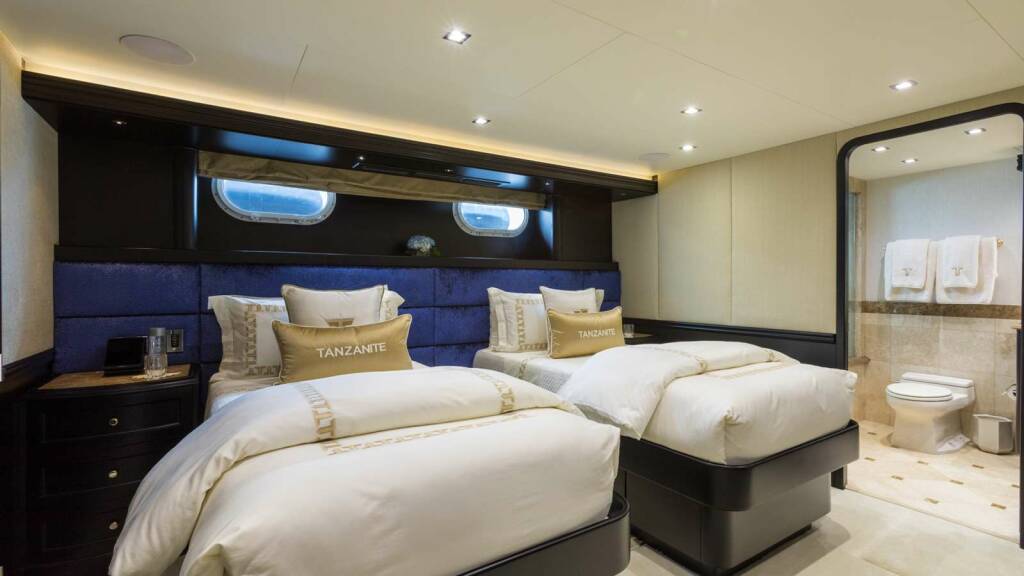 Accommodation: 10 guests in 5 suites comprising a master suite located on the main deck, two VIP cabins and two cabins that can operate as twins or doubles. There are 5 beds in total, all can be Kings. She is also capable of carrying up to 9 crew onboard to ensure a relaxed luxury yacht charter experience.